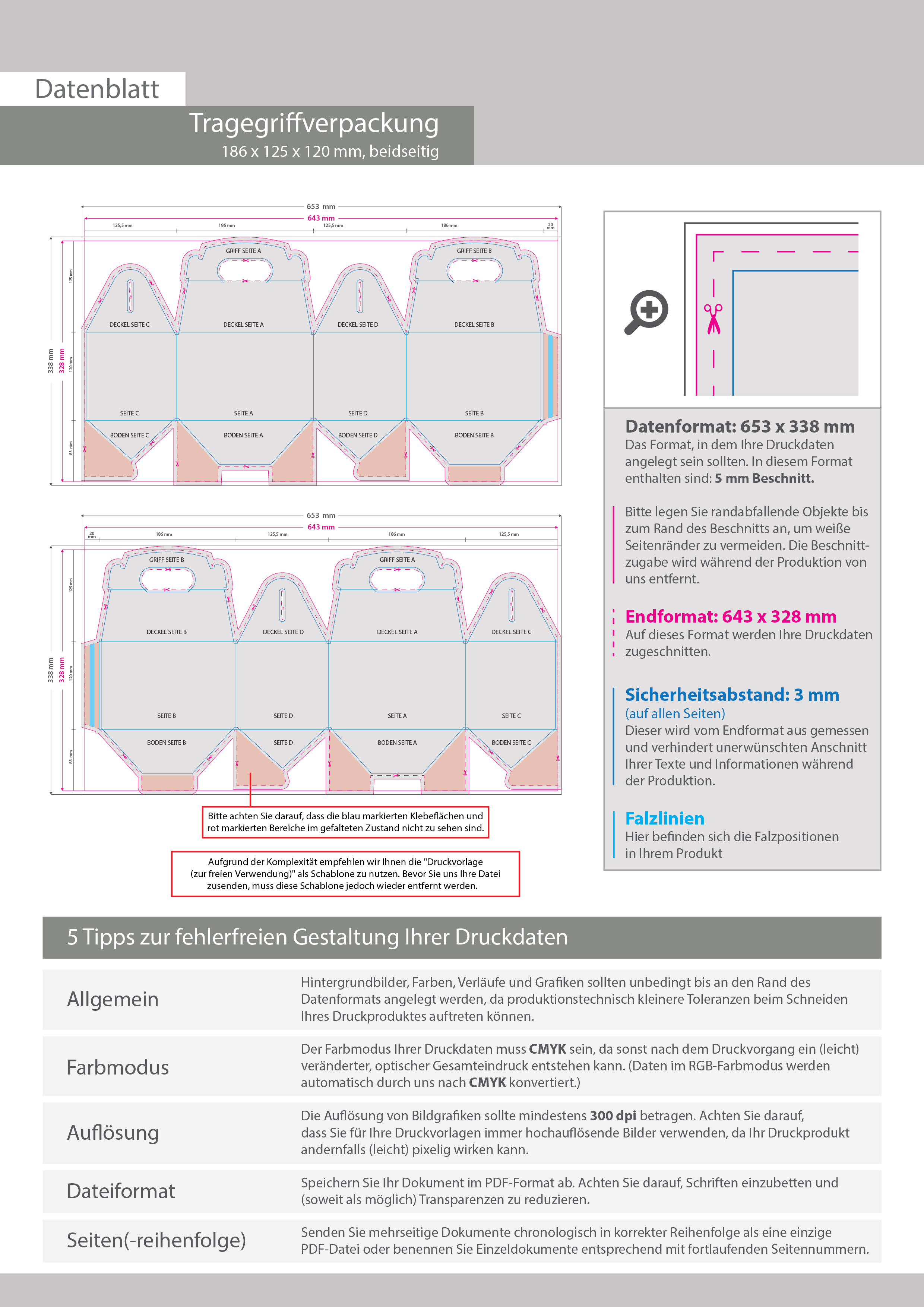 Tragegriffverpackung (18,6 cm x 12,5 cm x 12 cm) beidseitig bedruckt 5/4-farbig (CMYK + Sonderfarbe)