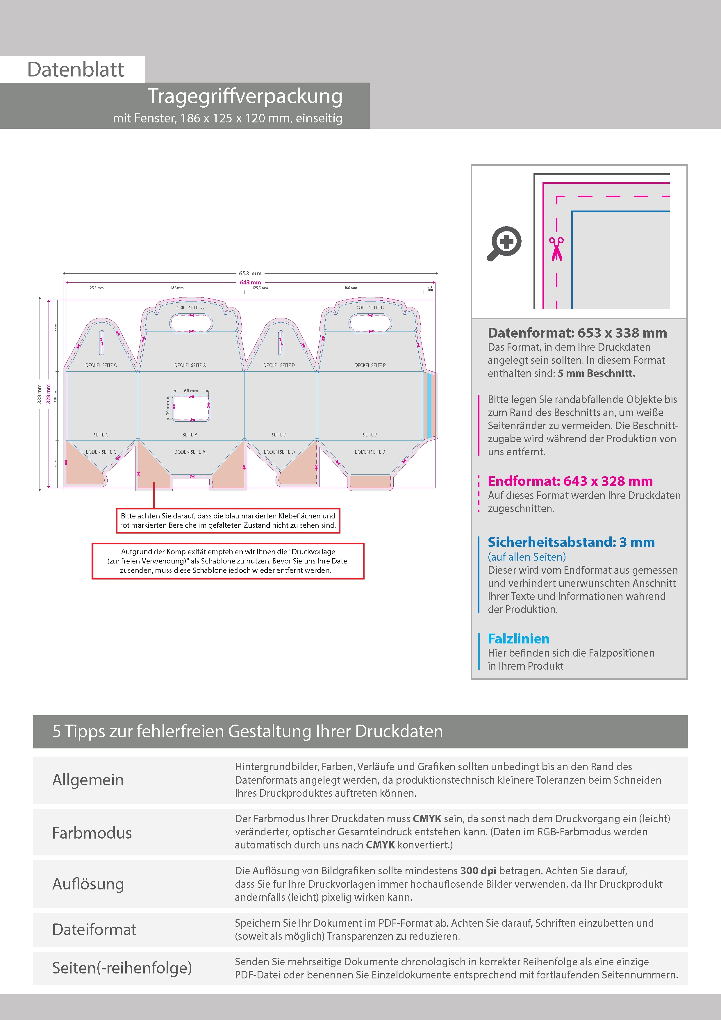 Tragegriffverpackung (18,6 cm x 12,5 cm x 12 cm) einseitig bedruckt 4/0-farbig mit gestanztem Fenster