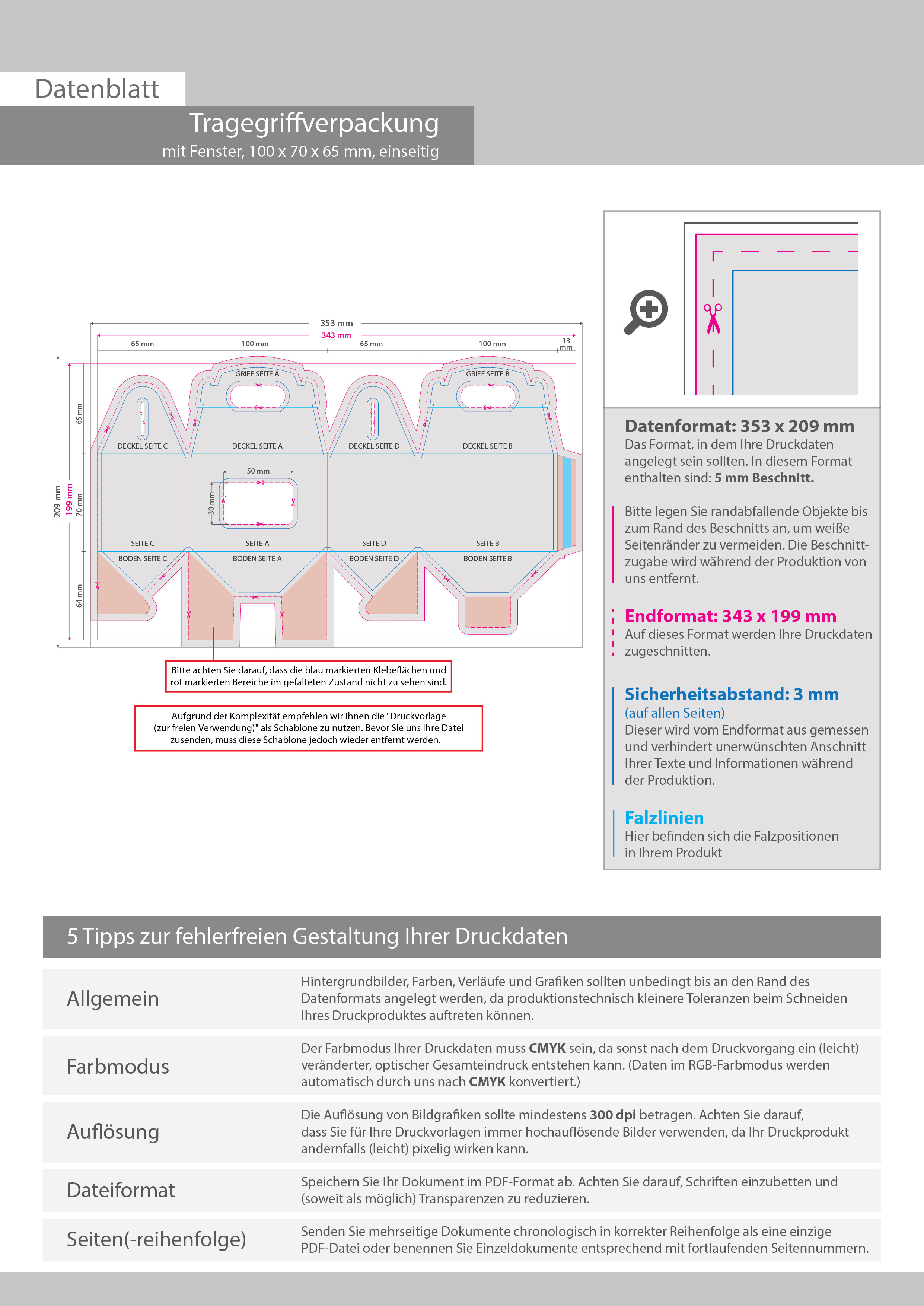 Tragegriffverpackung (10 cm x 7 cm x 6,5 cm) einseitig bedruckt 4/0-farbig mit gestanztem Fenster