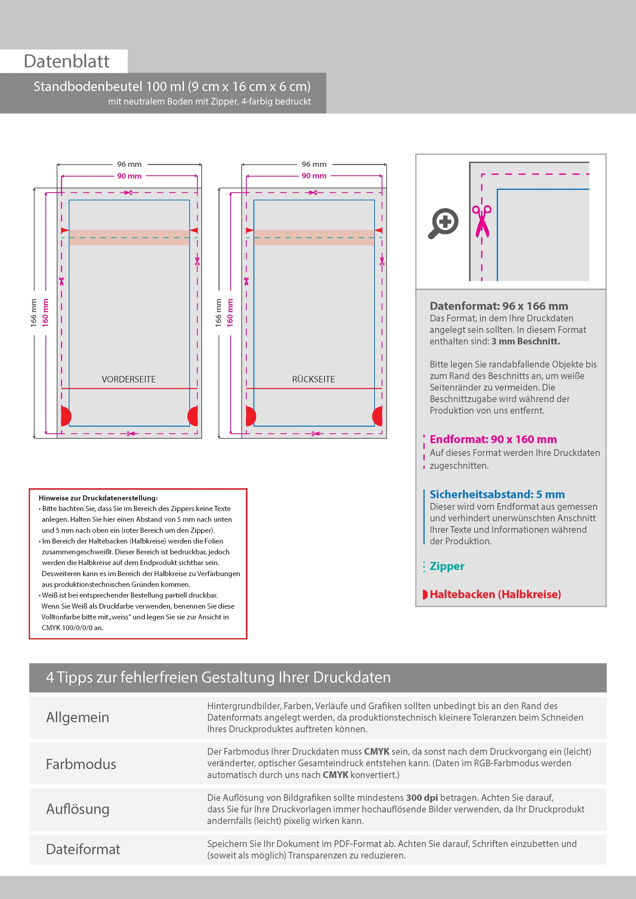 Standbodenbeutel 100 ml (9 cm x 16 cm x 6 cm) mit neutralem Boden mit Zipper, 4-farbig bedruckt