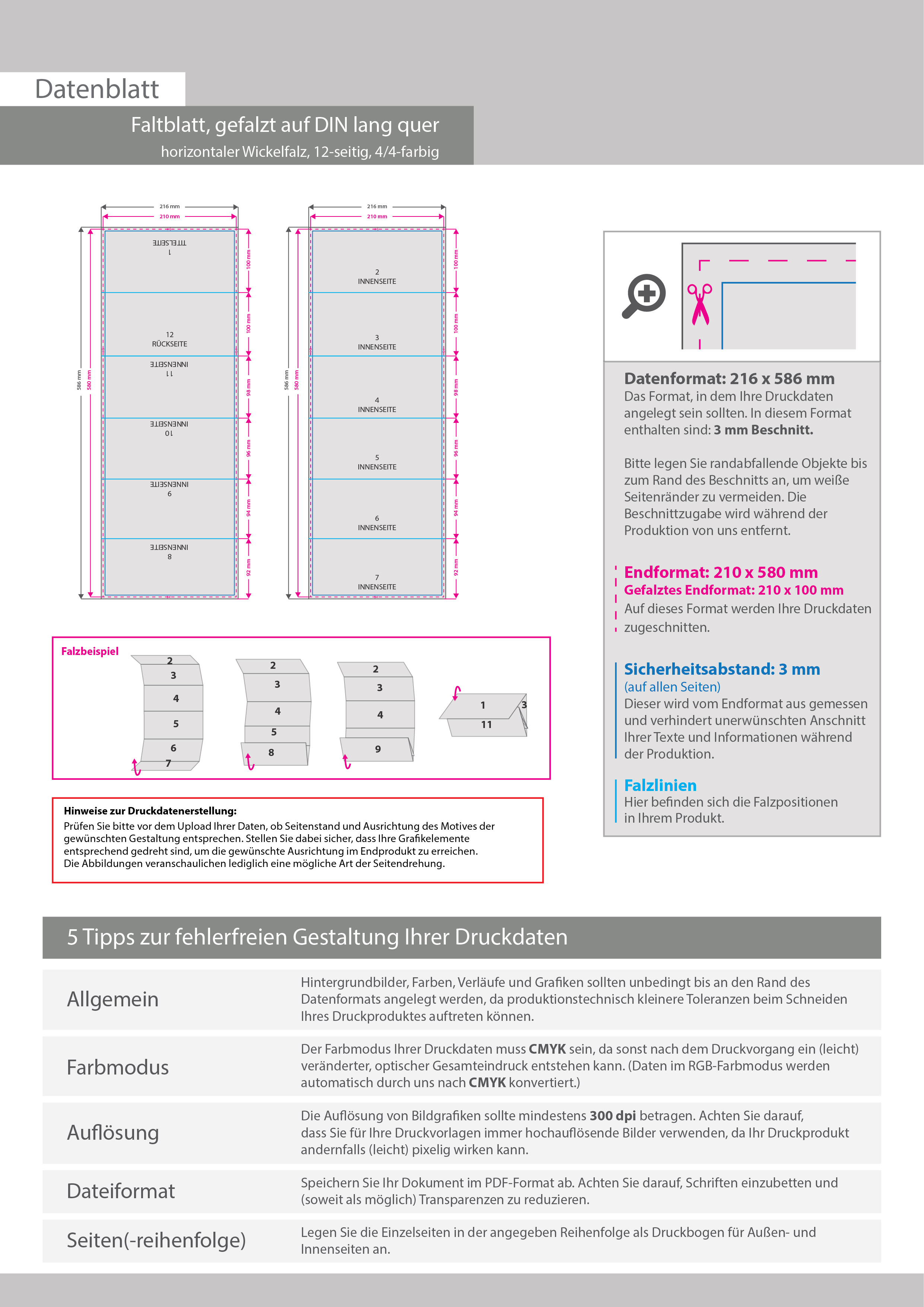 Faltblatt, gefalzt auf DIN lang quer, horizontaler Wickelfalz, 12-seitig