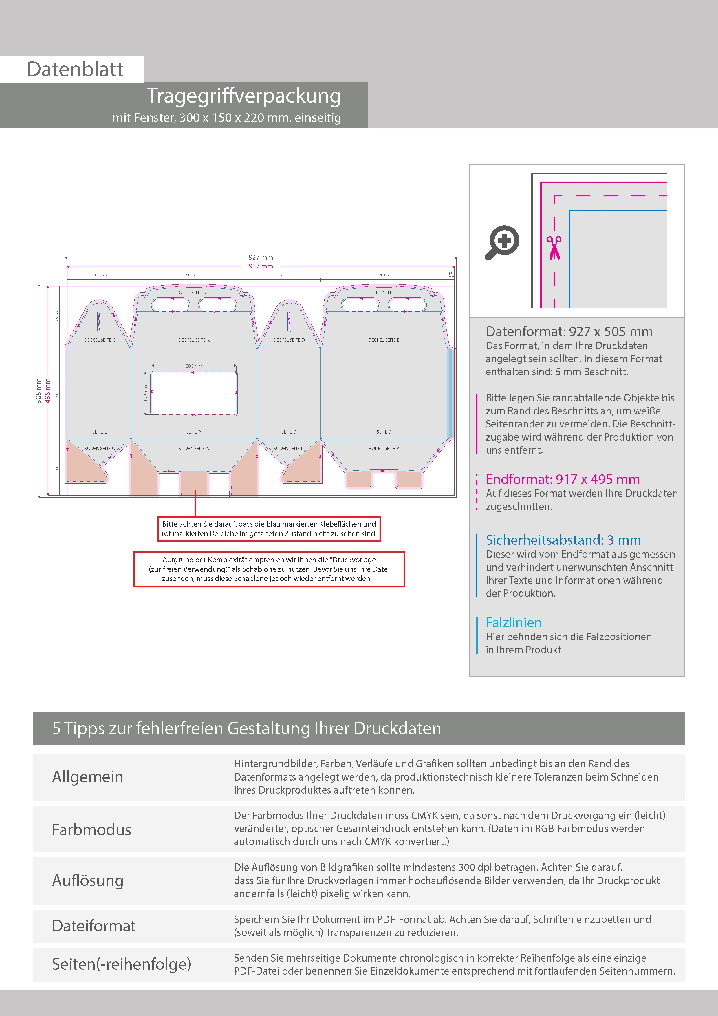 Tragegriffverpackung (30 cm x 15 cm x 22 cm) einseitig bedruckt 4/0-farbig mit geklebtem Fenster