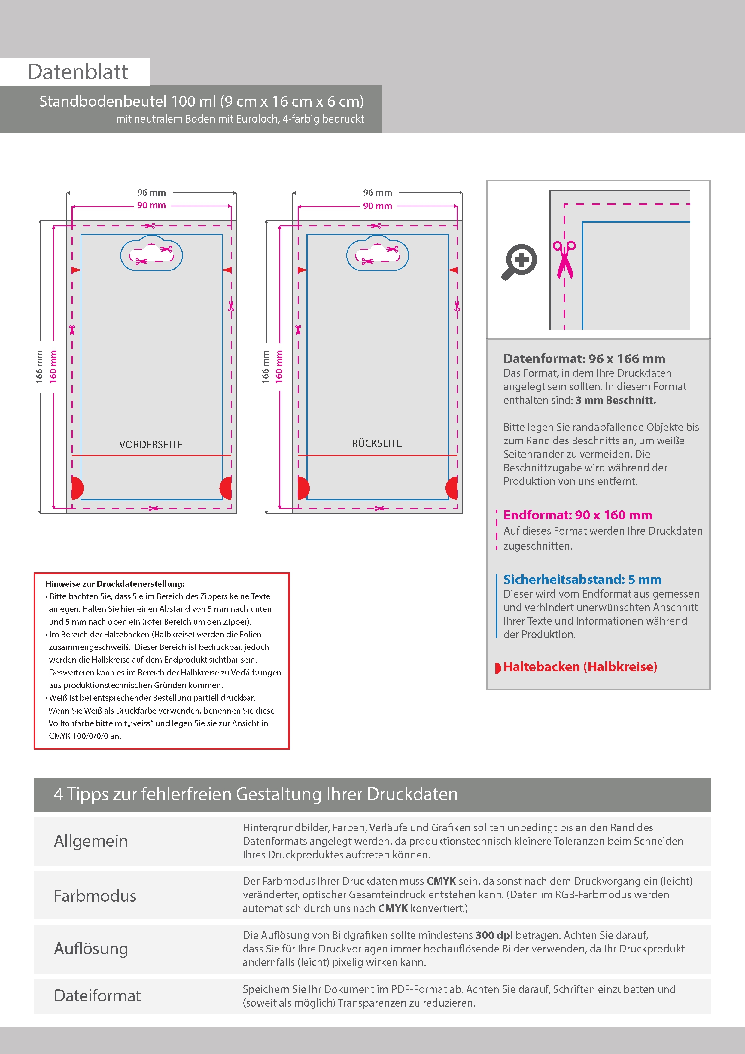 Standbodenbeutel 100 ml (9 cm x 16 cm x 6 cm) mit neutralem Boden mit Euroloch, 4-farbig bedruckt